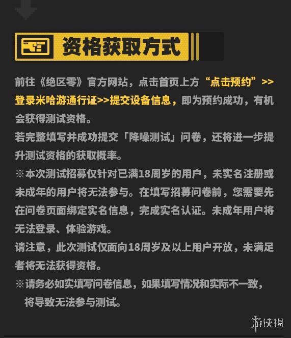 4、未成年用户将无法登录、体验游戏。请注意,此次测试仅面向18周岁及以上用户开放,未满足者将无法获得资格。请务必如实填写问卷信息,如果填写情况和实际不一致,将导致无法参与测试。