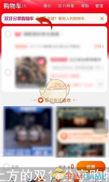 1、打开【淘宝】客户端,然后点击底部的【购物车】图标,进入购物车页面,点击页面上方的【双11分享购物车】活动栏,进入双11一起分享购物车页面,