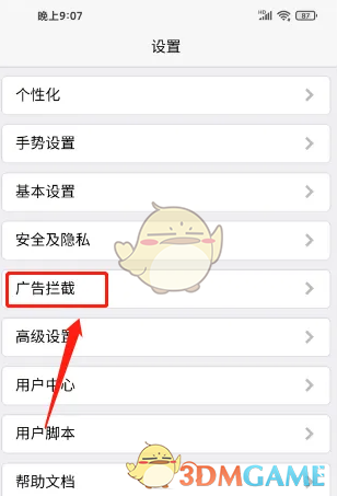 3、进入设置,点击【广告拦截】。